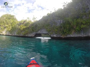 Kleine Unterführung vorausDie ersten zwei Tage der Kajaktour waren sehr angenehm. Wir hielten uns meist in ruhigem Gewässer auf und waren von den Rock Islands geschützt.