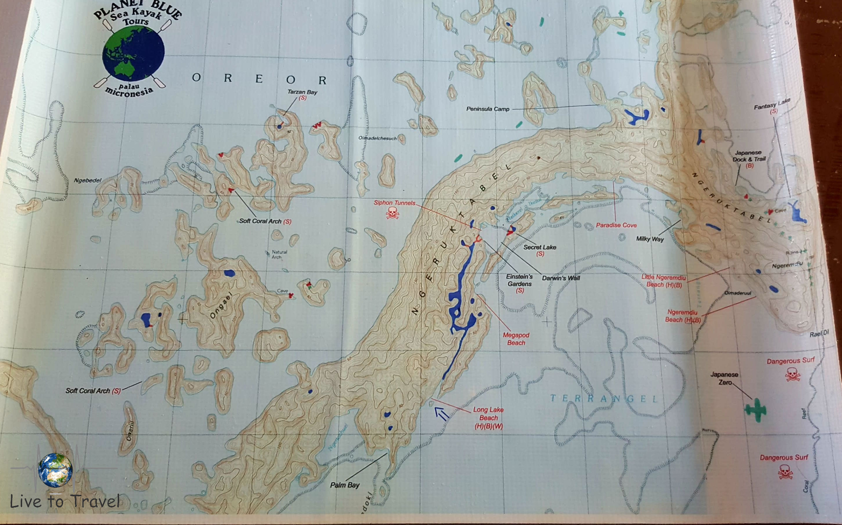 Karten zur Orientierung auf PalauEine Kajaktour, bei der du für alles selber sorgen musst, ist auf Palau wirklich nicht günstig. Doch wir gaben nicht auf und wurden fündig. Die Jungs von Paddling Palau können dir in der Regel interessante Touren anbieten. Wir entschieden uns für eine Mehrtagestour und können diese nur wärmstens empfehlen. Du sprichst mit den Jungs über deine Vorstellung von der Tour. Wo du überall hin möchtest, wieviel Zeit du einplanen willst und was dein Zielort sein soll kannst du selbst bestimmen. Wenn es dann soweit ist, bekommst du von Paddling Palau eine gründliche Einweisung mit wasserfesten Karten und allem was sonst noch dazu gehört.