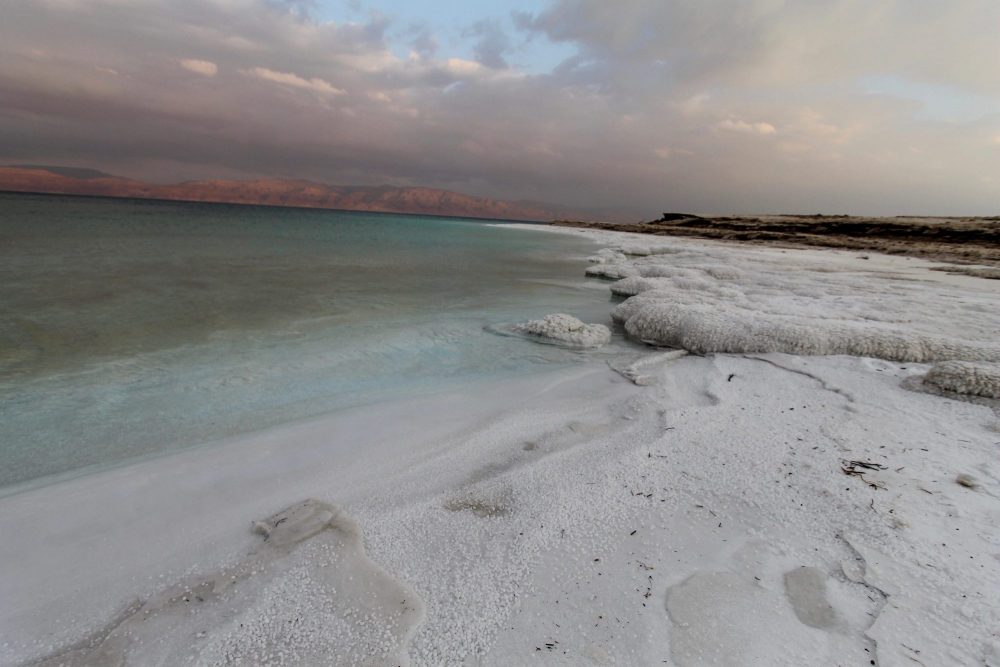 Links das Tote Meer, mit seiner unglaublichen Farbgebung und schönen Salzkristallen, etwa 430 m unter dem Meeresspiegel, und rechts eine Bergkette. Traumhaft schön.