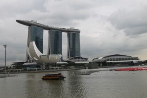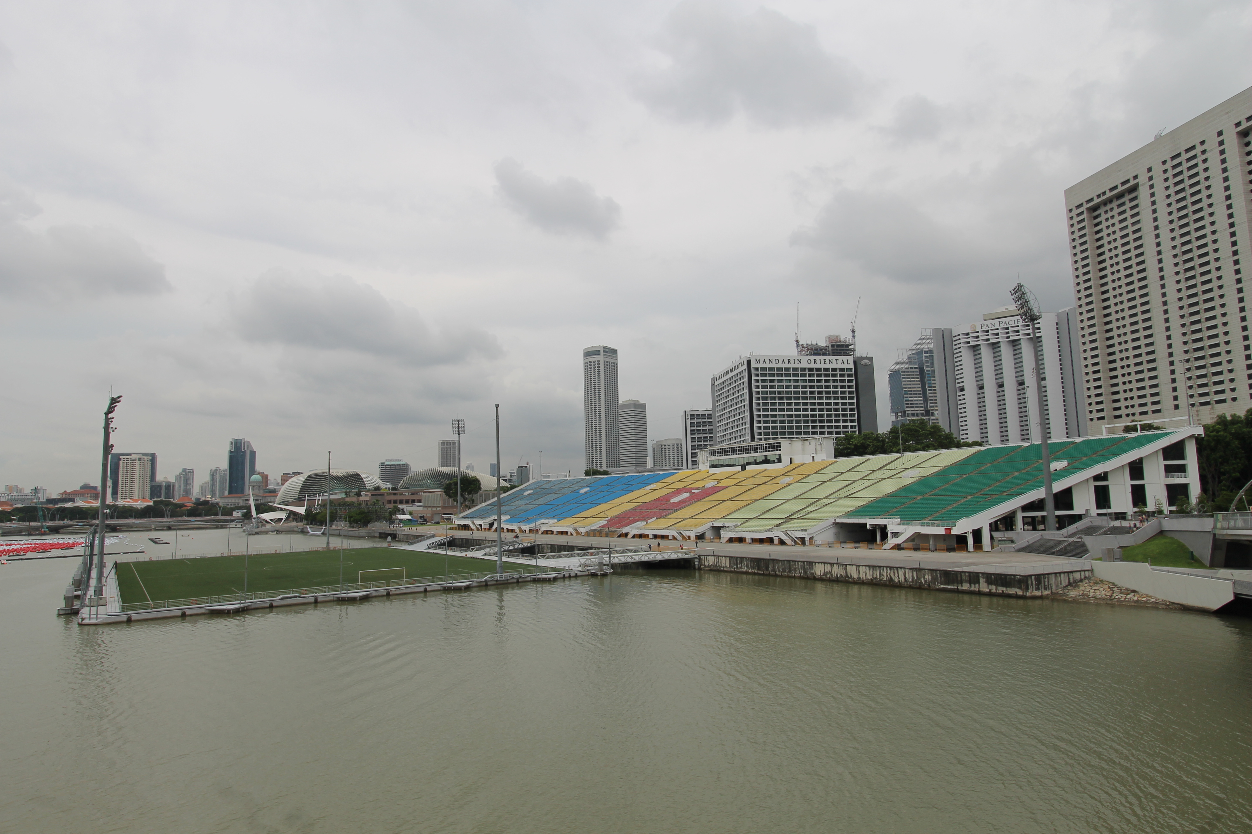 Für mich ging es vorbei an dutzenden Einkaufszentren. Davon gibt es hier irgendwie an jeder Ecke eines und alle sind prunkvoll ausgerüstet mit ganz schön noble Läden. Ich war auf dem Weg zum Singapur River. Und ich kam an etlichen interessanten Gebäuden vorbei. Unter anderem am Singapur Flyer. Das ist ein Restaurant in einem Riesenrad, in dessen Kabinen Tische aufgebaut sind. Ich kam auch am Floating „Fussballstadion“ und am Hotel Marina Bay vorbei. Das Hotel hat angeblich eines der coolsten Dachpools der Welt.