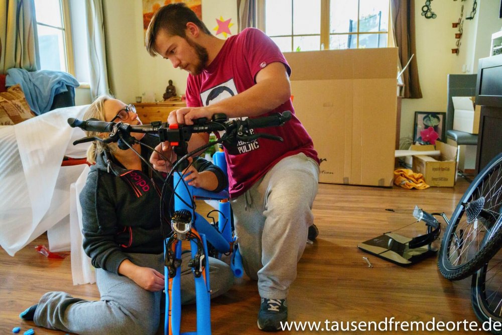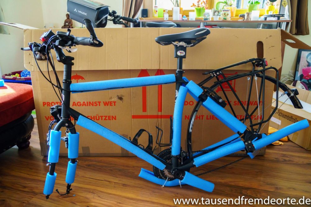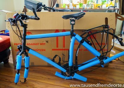 Nun haben wir hier 2 Räder, die nicht gerade günstig waren. Wie verpackt man die am besten, dass diese auch den Flug überstehen? Eine Frage, die uns die ganze Zeit beschäftigt hat.