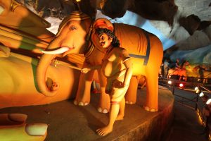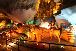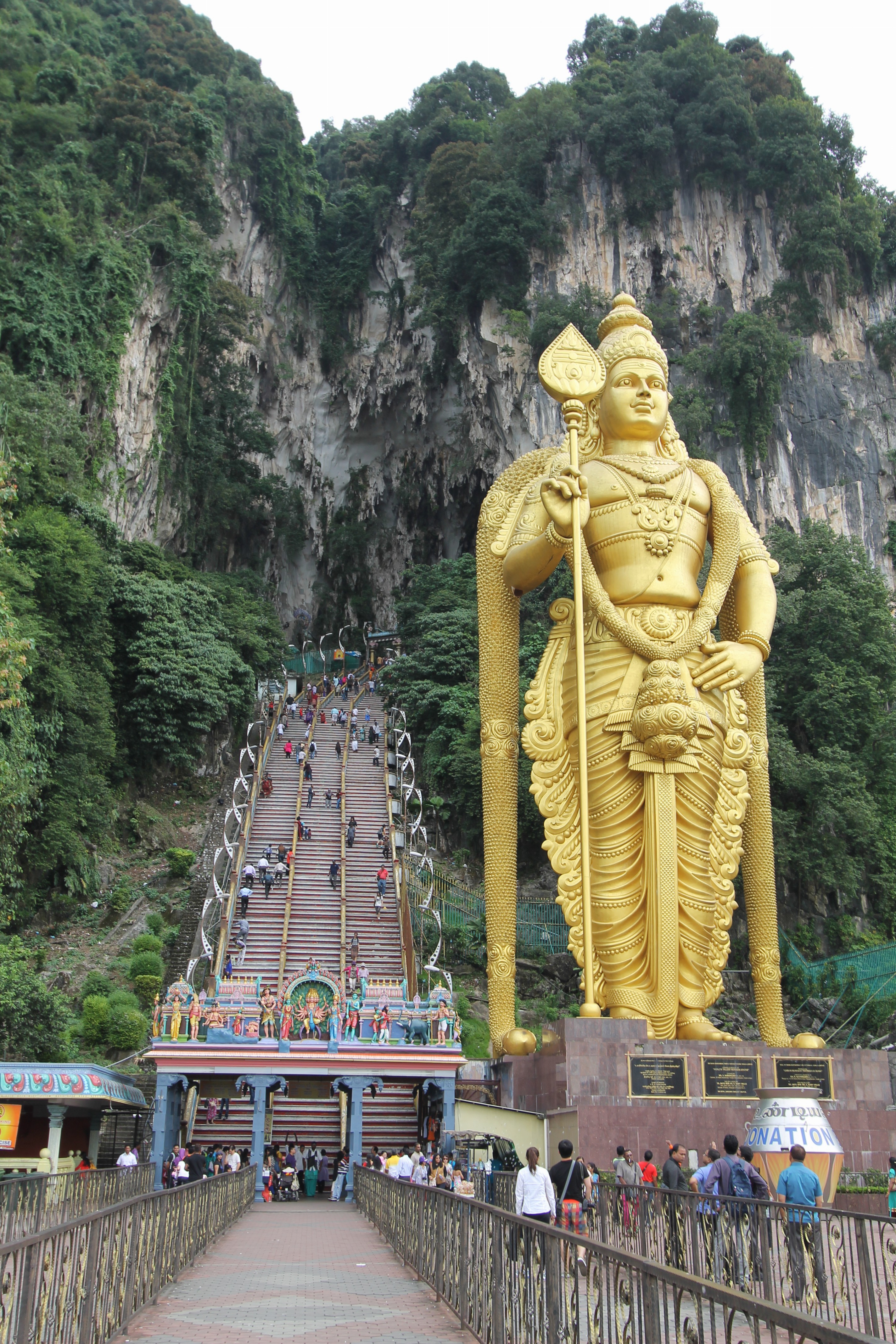 Dort angekommen konnte man die Höhle gleich sehen. Vor dem Höhleneingang ragt die 42 Meter hohe goldene Statue des Gottes Murugan und danach geht es 272 Treppenstufen steil bergauf, bis man schlussendlich den Eingang erreicht. Hier kannst du auch schon die ersten herumtollenden Affen beobachten, wie sie versuchen den Menschen ihr Essen zu klauen. Beliebt sind natürlich kleine Bananen, die man vorher an Ständen kaufen kann.