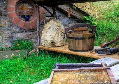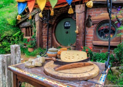 Vorbei an dem Gärtner und dem Imker. Hier wird der Honig aus den Waben gewonnen und die Honiggläser stehen für die Bewohner der Hobbit-Dorfes vor der Tür. Dann geht es den Berg hinauf. Vorbei am Müller, vorbei am Bäcker, der draußen vor der Tür leckeres Brot und Gebäck liegen hat. In einigen Gärten hängt noch die Wäsche zum trocknen auf der Leine.
