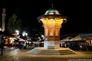 Sehenswürdigkeit der Wasserbrunenn Sebilj in Sarajevo bei Nacht