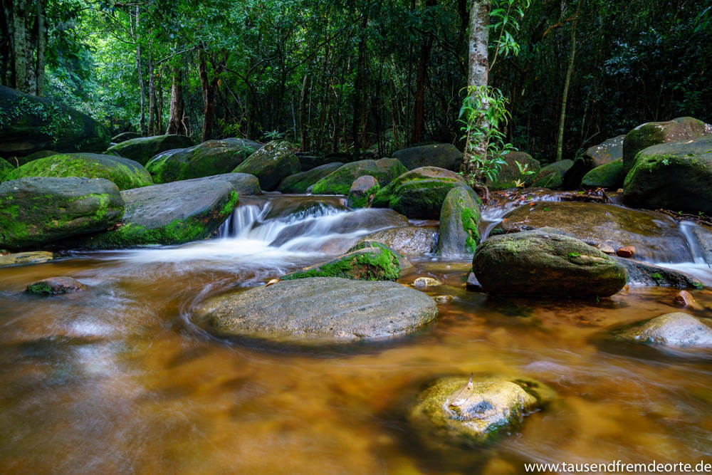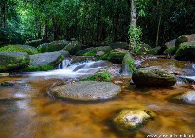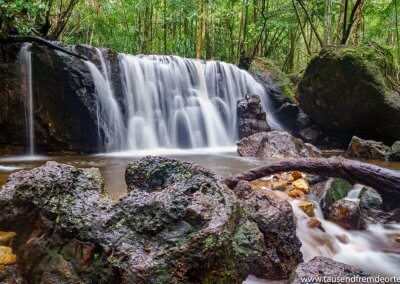 Der Weg zum Wasserfall ist traumhaft. Du läufst immer am Bach entlang, bis der Weg dich nach etwa 30 Minuten über Stock und Stein an den Wasserfall führt. Es ist kein gigantischer Wasserfall, aber du könntest dort sogar baden gehen, wenn du das wolltest. Er ist nur 4 Meter hoch, aber dennoch ein sehr beliebtes Ausflugsziel, auch bei Vietnamesen.
