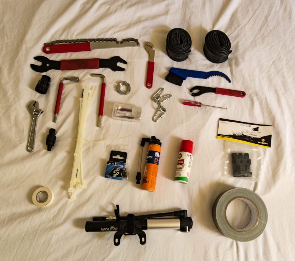 Und da wir mit den Fahrrädern unterwegs sind, benötigen wir ja leider Gottes eine Menge Werkzeug und Ersatzteile. Und die sind auch noch ziemlich schwer. Ganze 8 Kilogramm nehmen diese Sachen für sich in Anspruch.